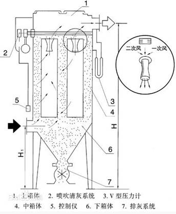袋式除塵器是一種干式濾塵裝置,通過篩濾、碰撞、滯留、擴散、靜電等效應(yīng)將氣流中的粉塵截流去除。其除塵機理為:含塵氣體由灰斗(或下部寬敞開式法蘭)進入過濾室,較粗顆粒直接落入灰斗或灰倉,灰塵氣體經(jīng)濾袋過濾,粉塵阻留于濾袋表面,凈氣經(jīng)袋口到凈氣室、由風(fēng)機排入大氣,當濾袋表面的粉塵不斷增加,導(dǎo)致設(shè)備阻力上升至設(shè)定值時,時間繼電器(或微差壓控制器)輸出信號,程控儀開始工作,逐個開啟脈沖閥,使壓縮空氣通過噴口對濾袋進行噴吹清灰,使濾袋突然膨脹,在反向氣流的作用下,附于濾袋表面的粉塵迅速脫離濾袋落入灰斗(或灰倉)內(nèi),粉塵由卸灰閥排出,全部濾袋噴吹清灰結(jié)束后,除塵器恢復(fù)正常工作。