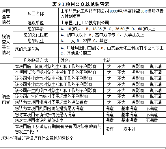 本次公眾意見調(diào)查的目的主要是了解項(xiàng)目周圍群眾對(duì)山東顯元化工科技有限公司8000噸/年高性能SBR橡膠瀝青改性劑項(xiàng)目建設(shè)期間以及試生產(chǎn)期間的意見和建議,給周圍群眾表達(dá)他們意見的機(jī)會(huì)。