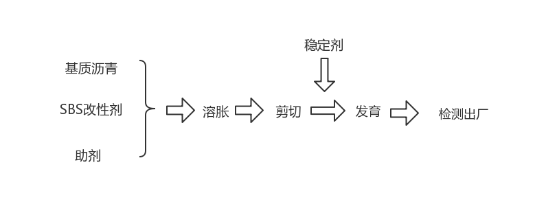 目前,世界范圍內(nèi)最常使用的瀝青改性劑為力學(xué)改善型的SBS、SBR、廢舊膠粉等,其余的通常以復(fù)合改性助劑的身份存在。SBS、SBR、廢舊膠粉改性瀝青的加工流程基本一致,下面以最常使用的SBS改性瀝青為例,對改性瀝青的生產(chǎn)方法進(jìn)行說明。
