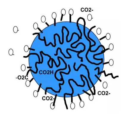 SBR膠乳粒子單元是一種核殼結(jié)構(gòu),殼內(nèi)是共聚物分子鏈的交聯(lián)結(jié)構(gòu),外殼是親水性的極性基團(tuán)和表面活性劑,所以油性的苯乙烯和丁二烯聚合體能夠穩(wěn)定存在于水中